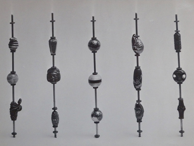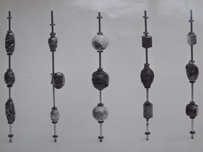 The work on some of the mixed metal beads is rather fine. Since the abolition of the wearing of swords in 1872, many sword furniture makers were put out of business, but were able to eke out a living by turning their skill to objects made for the burgeoning export market.