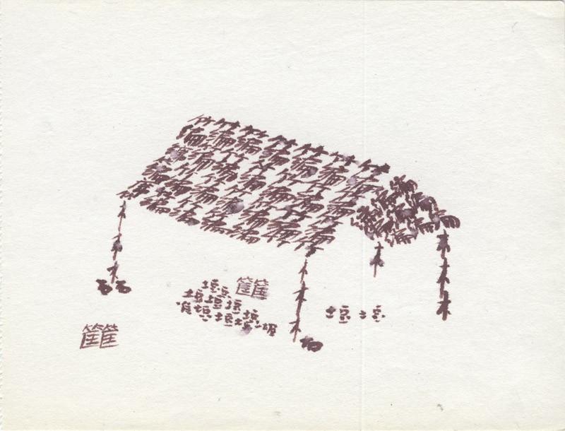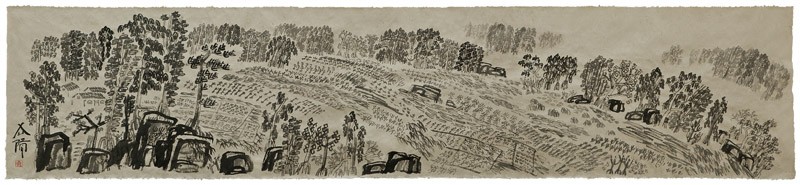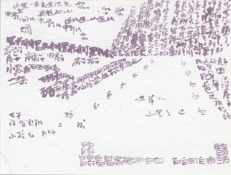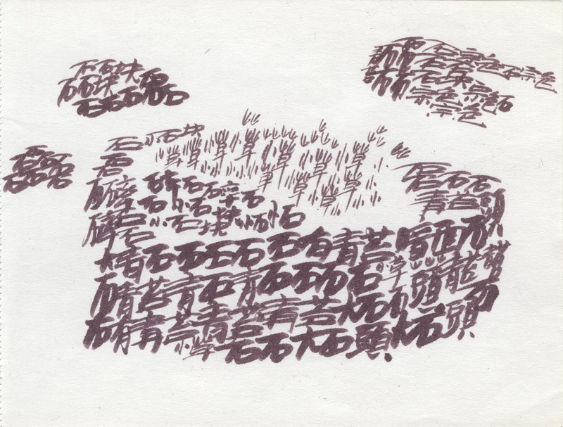These sketches were drawn in 1999 when Xu Bing went to the Himalayas, on a visit organised by the Kiasma Museum of Contemporary Art, Helsinki. Sitting on a mountain, he looked at a mountain and drew the Chinese character for mountain. These sketches are some of the first landscripts he drew and show how the method developed: the character 水(water) for river water, 木 (tree) to depict trees.