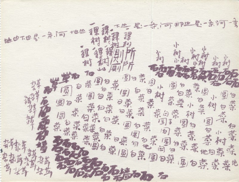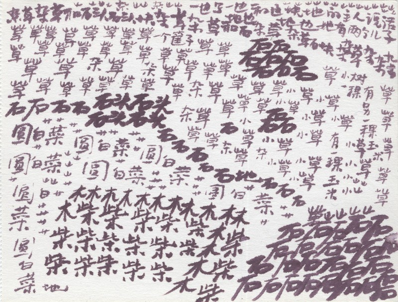 In 1999 in the Himalayas, Xu Bing sat on a mountain and used Chinese characters to depict the rivers and mountains before him. This was possible because the earliest Chinese characters were simple pictures, and the modern language retains many pictorial elements. More recently he has developed this idea to create landscapes that use characters as though they were painted brushstrokes. For example, groups of characters for a type of tree are arranged to compose a picture of that tree.