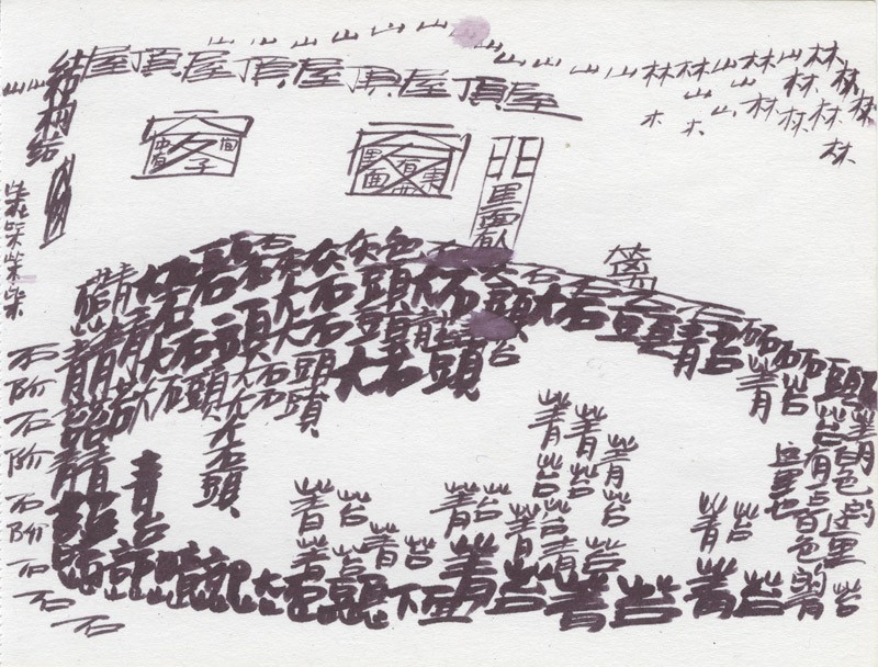 The sketches also include some methods that he discontinued. For example, some include phrases that describe the scene. Others use characters that note with a modern character the thing that they represent, even though the modern character does not have any pictorial content. For example, the runway markings on the sketch of Kathmandu airport are represented by repetitions of the character 白 (white).