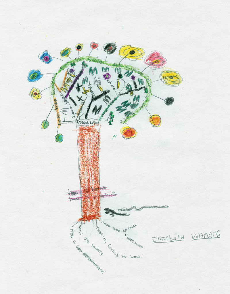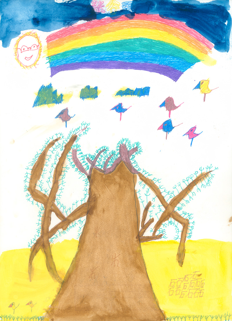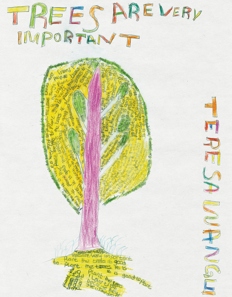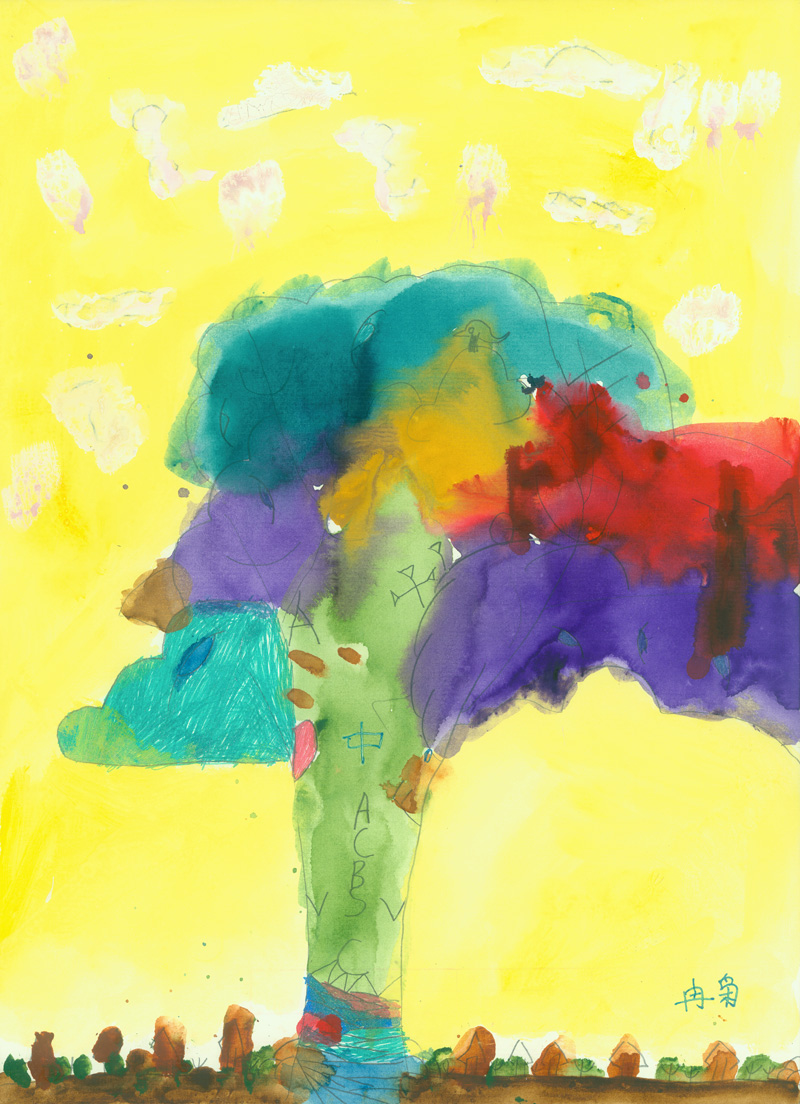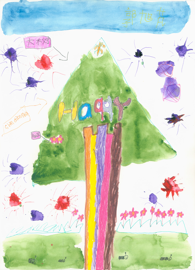 These pictures were made by children aged 8–12 in Kenya (2008) and Shenzhen, China (2009) as part of Xu Bing’s Forest Project. The drawings use nature and words to make images of trees. It was in response to these and other drawings that Xu Bing produced the large paintings displayed above.