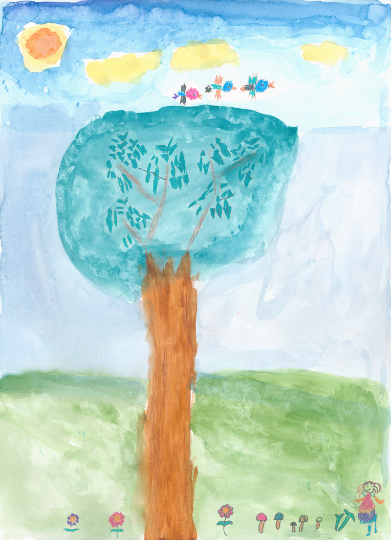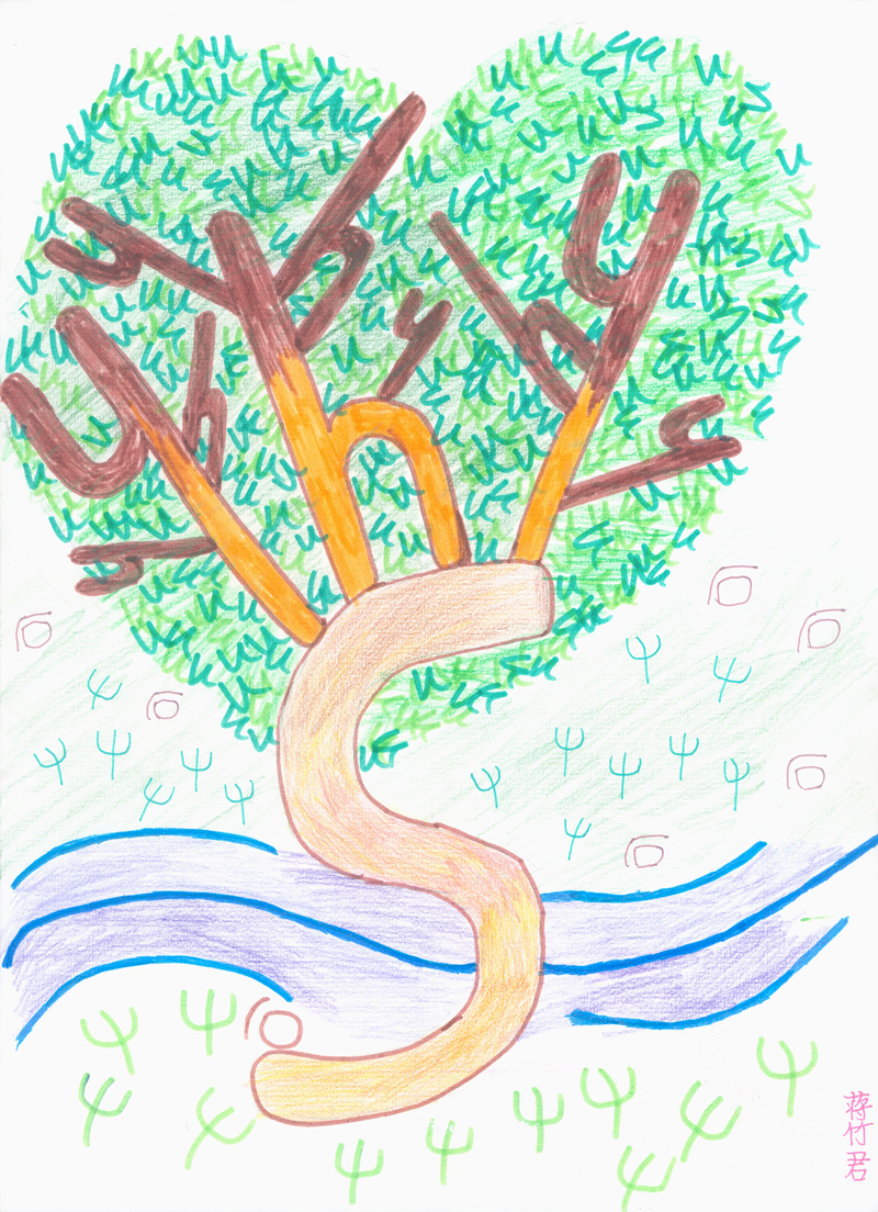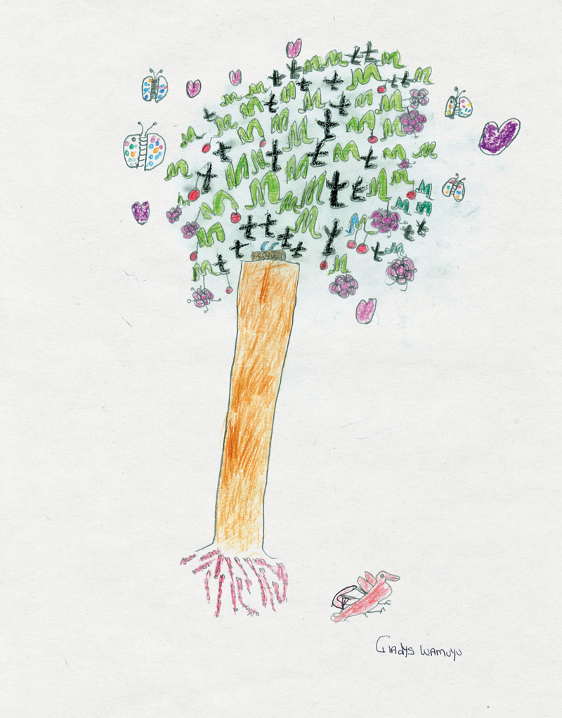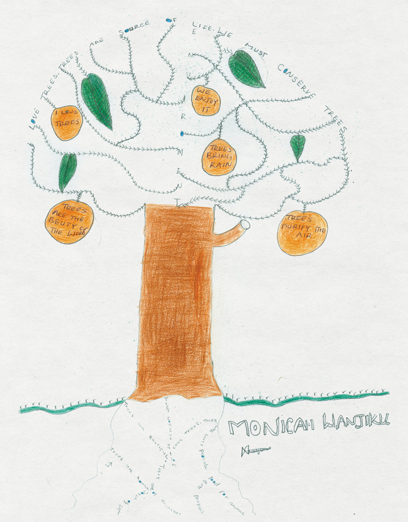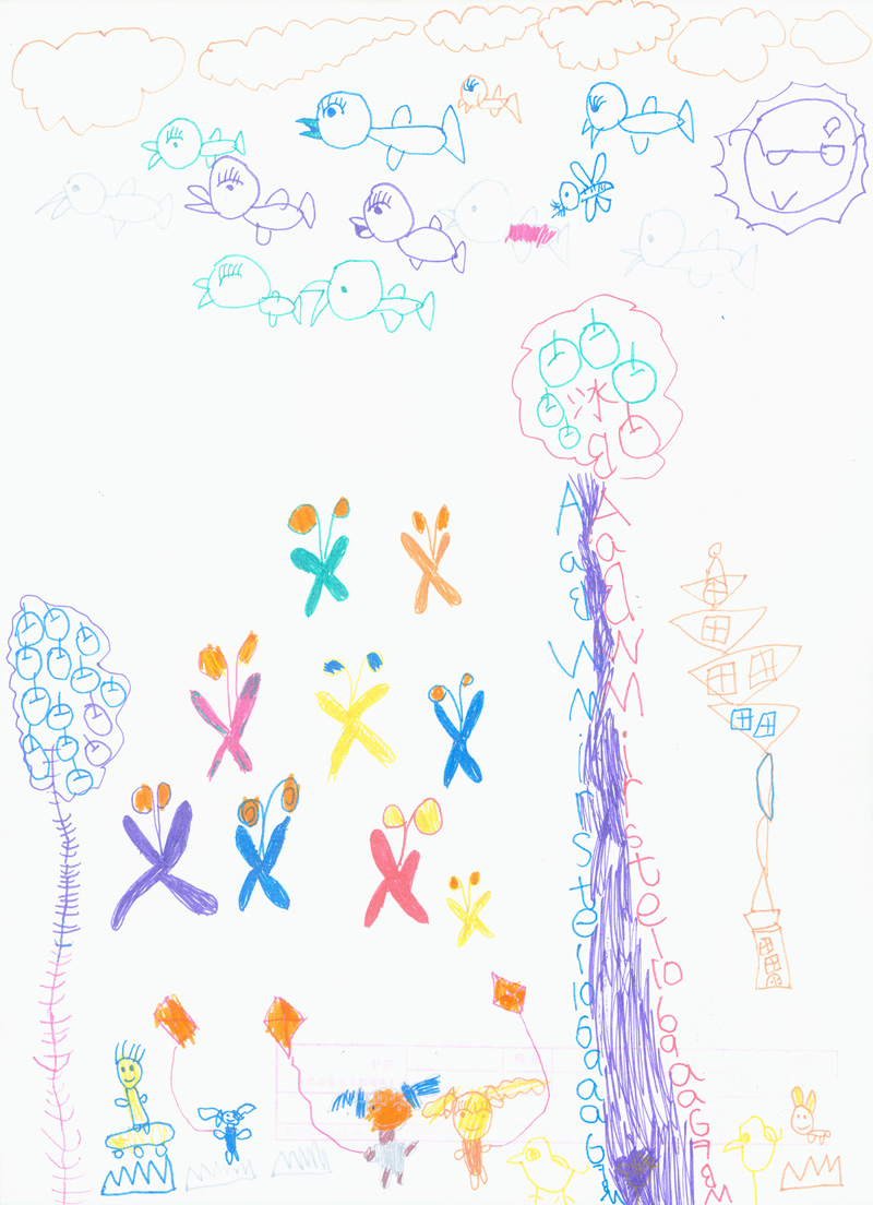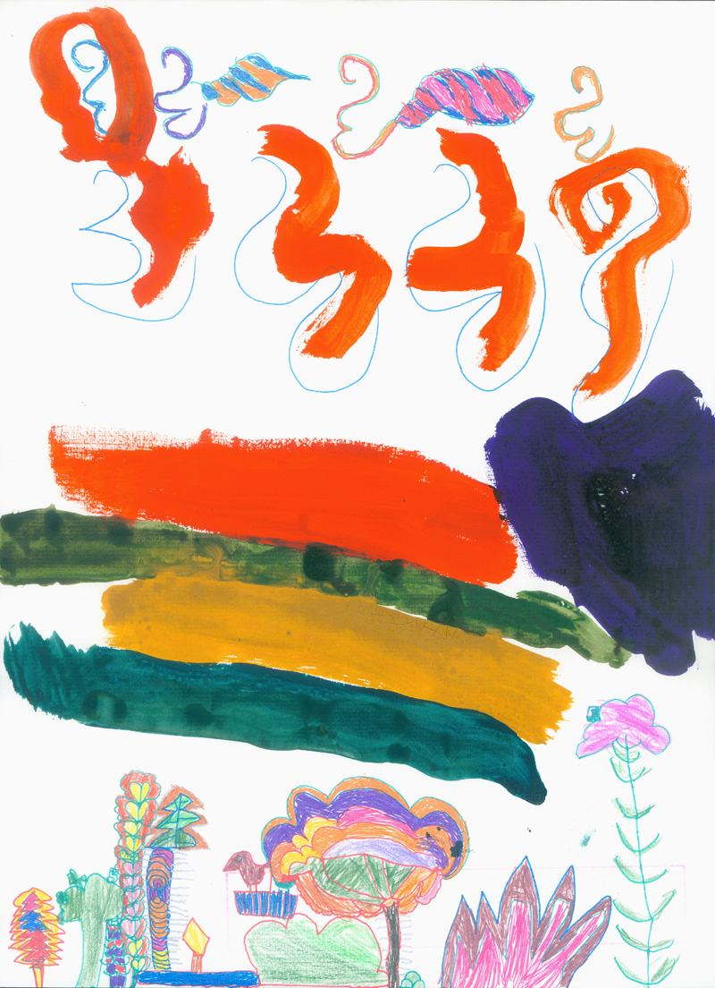 These pictures were made by children aged 8–12 in Kenya (2008) and Shenzhen, China (2009) as part of Xu Bing’s Forest Project. The drawings use nature and words to make images of trees. It was in response to these and other drawings that Xu Bing produced the large paintings displayed above.