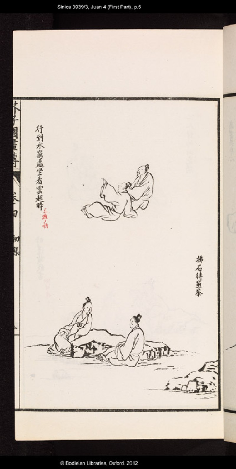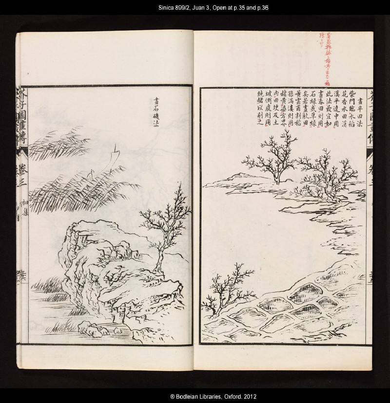 The volumes displayed here show images that Xu Bing has used in the Mustard Seed Garden Landscape Scroll. They are selected from ten different editions in the collection of the Bodleian Library, University of Oxford. The Bodleian began acquiring Chinese books and manuscripts around 1600.