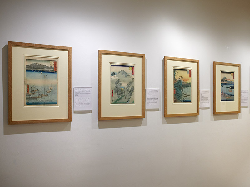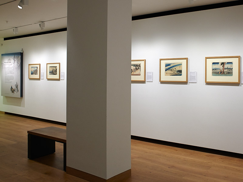 Utagawa Hiroshige (1797-1858) was one of the great masters of the Japanese landscape print. The print series that established his reputation in the early 1830s was the Fifty-three Stages of the Tōkaidō Road. This series depicts scenes along the Tōkaidō, the major highway that linked the cities of Edo and Kyoto. Hiroshige balanced striking landscape views with detailed, often humorous depictions of travellers and their encounters with local customs and various weather conditions. The series was so successful that Hiroshige went on to produce several more sets of views along the road.