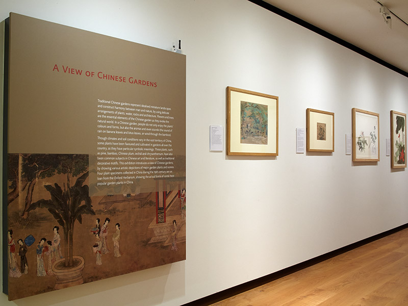 Though climates and soil conditions vary in the vast territory of China, some plants have been favoured and cultivated in gardens all over the country, as they have particular symbolic meanings. These plants, such as pine, bamboo, Chinese plum, orchid and chrysanthemum, have also been common subjects of Chinese art and literature, as well as traditional motifs. This exhibition introduces a view of Chinese gardens, by showing various artistic depictions of major garden plants and scenes. Four plant specimens collected in China during the 19th century are on loan from the Oxford Herbarium, showing the actual forms of some most popular garden plants in China.