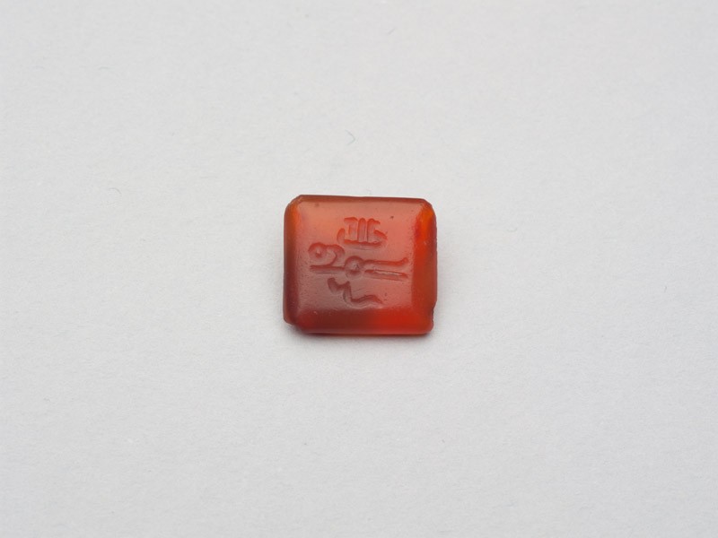 By far the commonest gem used for these seals is the cornelian. There are also, however, seven seals in chalcedony [26], five seals in jasper [27], three seals in lapis lazuli [28] and in green jade [29]; two seals in onyx [30] and one seal in obsidian [31], rock crystal [32], topaz [33], and amethyst [34]. Finally there is one seal in coloured glass imitating a gem [35]. Two gems are set in a silver ring [36]; one gem is set in a silver setting [37], and one in a gold setting (apparently a pendant)[38]; one other seal is set in a brass signet [39].