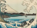 The high viewpoint in this print enables Hiroshige to emphasise the great height of Mount Fuji. Fuji, the sacred mountain, had long been a favourite subject for poets and painters and there was great public interest in Mount Fuji during the mid-1800s, when Hiroshige was working on this series. It is interesting to note that there is no reflection of the mountain in Lake Motosu below.