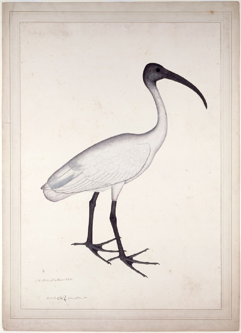 A wading bird thriving in marshy wetlands, the Oriental White Ibis (or Black-headed Ibis) is widely found in the Indian subcontinent and Southeast Asia. It has white or greyish plumage and a black head and legs. Shaikh Zain ud-Din’s study of this bird (identified here as buz) is among the last phase of commissions that he carried out for Lady Impey in 1782, shortly before the Impeys departed for England early in the following year.