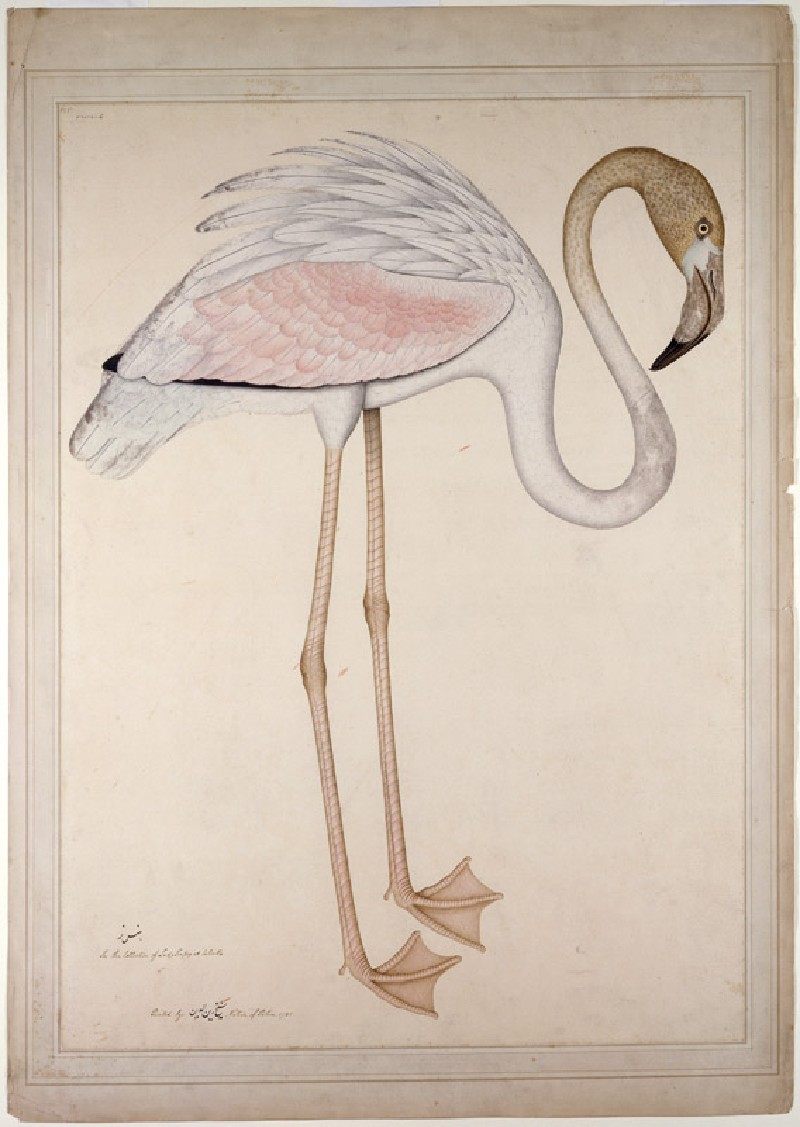 The largest and most widespread flamingo species, the Greater Flamingo is found in parts of southern Europe, Africa and Asia, including coastal areas of India and Pakistan. It is the state bird of Gujarat. It favours salt-marshes and shallow lagoon habitats. A shrimp-rich diet contributes to the pinkness of its plumage, not always well maintained in birds kept in captivity. Shaikh Zain ud-Din’s composition accommodates its long neck in a sinuous S-shaped undulation.