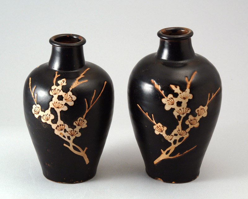 Of tall ovoid form, with splayed neck and thick rounded rim flange, the vases have a low, unevenly formed footring and a convex base. The pieces are covered with a thick, opaque dark brown glaze of matt sheen. On each side, a prunus branch has been reserved in the yellowish biscuit, the blossoms with stamens painted on in brown, and the thin offshoots at the end of the branches carved into the glaze in sgraffito technique. The footrings are left unglazed.