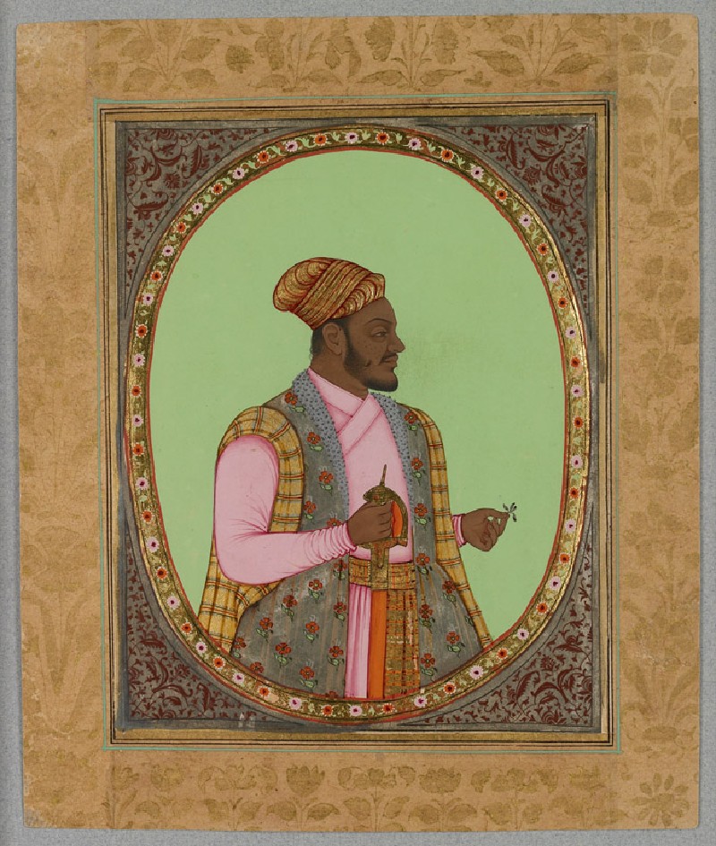 This painting of Sidi Masud Khan, a habshi (African) minister at the court of Bijapur, belonged to a Golconda series of portraits of eminent men. Masud Khan remained in power until 1683, not long before Bijapur fell to the Mughals. He then moved to Adoni in the Kurnool district, where he governed for a short time and built a notable mosque.