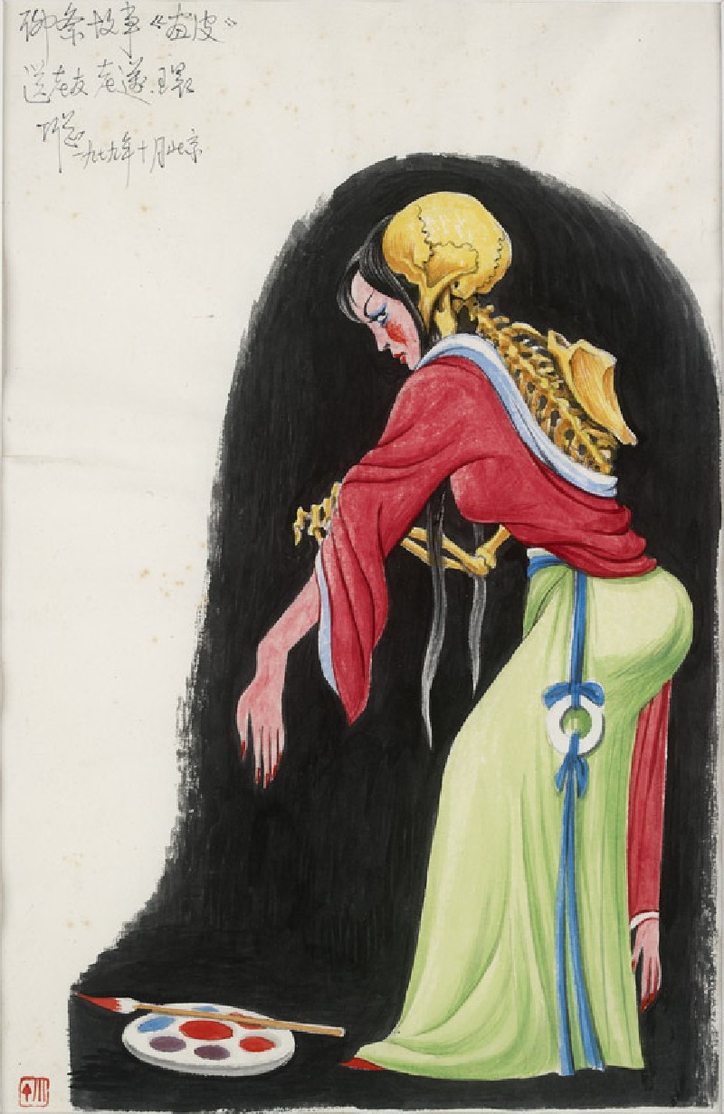 This figure is a demoness who disguises herself as a pretty teenage girl by painting her flayed skin in bright colours. In the story, the scholar Mr Wang admires her beauty and lets her stay in his studio. But at night, the demoness breaks into Wang’s bedroom and eats his heart in front of his wife.