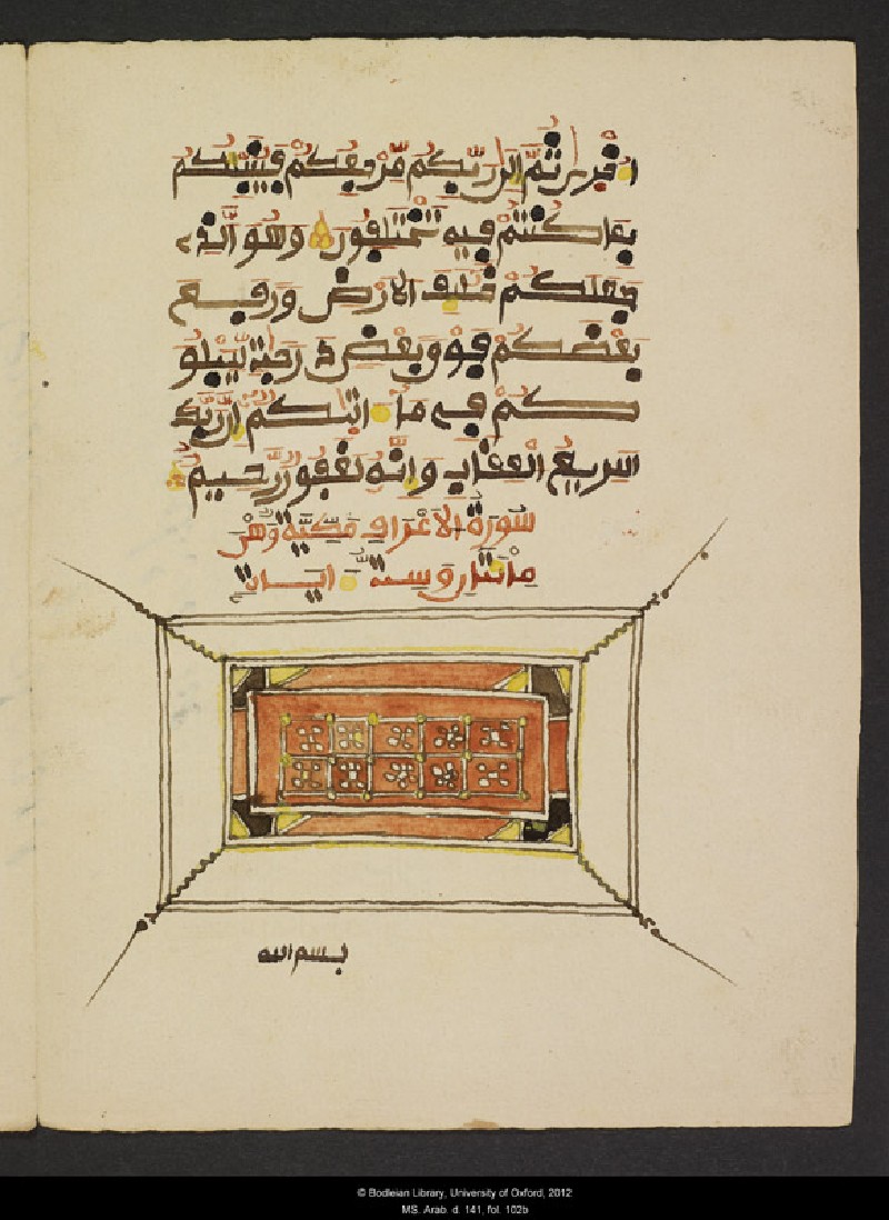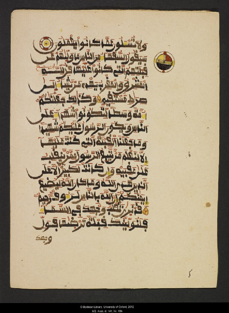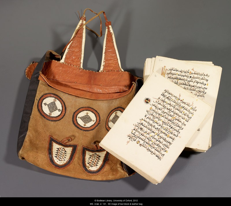 Exceptionally well preserved, this unbound Qur’an exemplifies the originality of West African book production. The text, written in a variant of the maghribi script, is divided into four parts marked by a full-page decoration that heavily draws on the designs used in the local textile production. The leather bag is contemporary with the text, and was used to store and conveniently transport the loose folios.