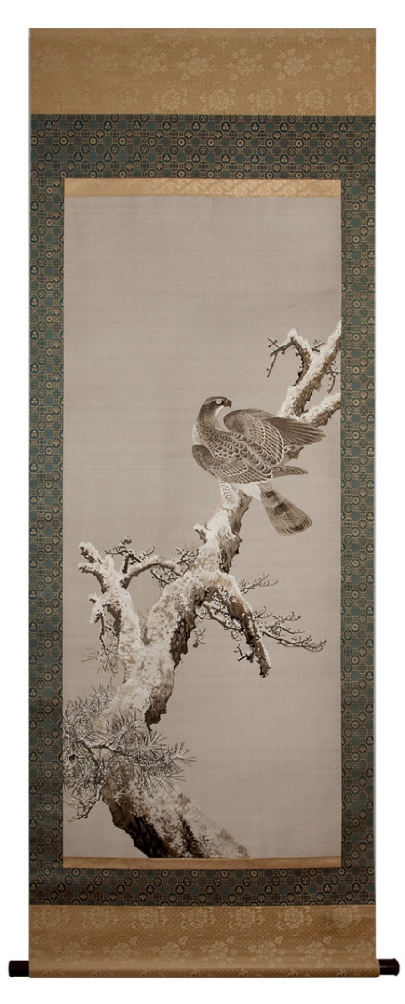 This exquisitely embroidered and elegantly mounted scroll was probably based on an original painting. There is a photograph of a very similar scroll in a sales album belonging to the leading Kyoto silk manufacturer Iida Shinshichi (Takashimaya). In front of the scroll is displayed an award certificate from a Kyoto Art Craft exhibition in 1894. Perhaps the scroll exhibited here was also made in the mid-1890s. (Exhibition number 13)