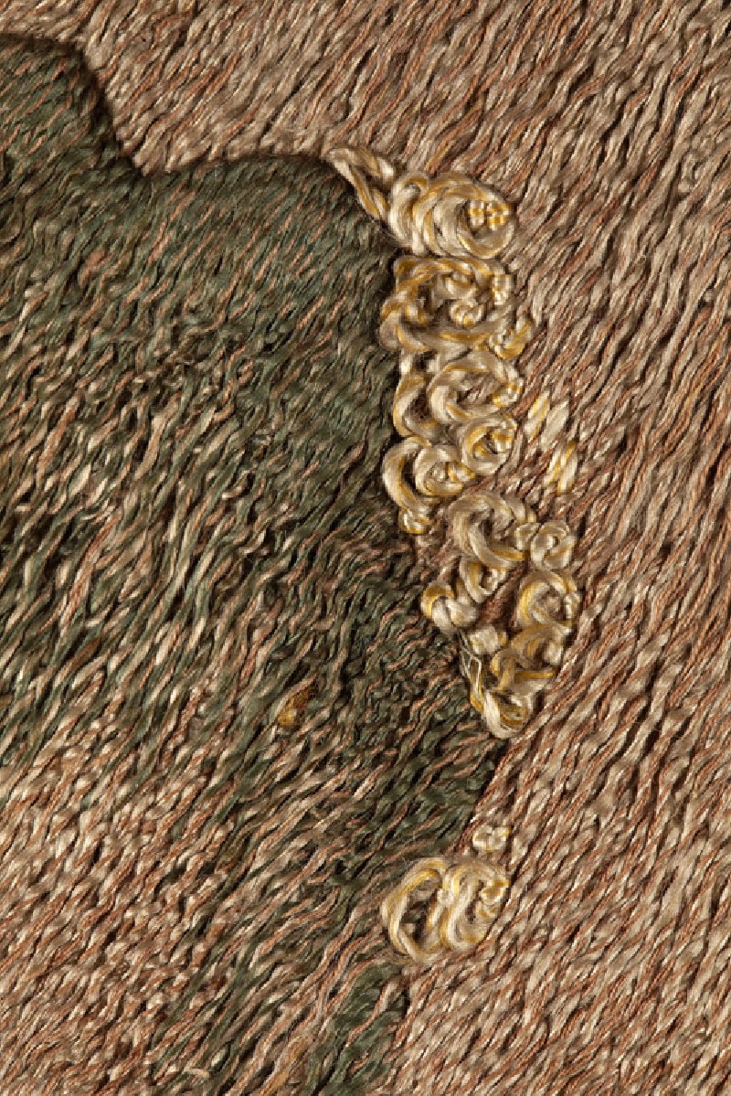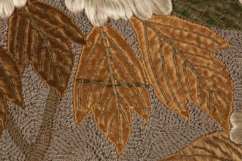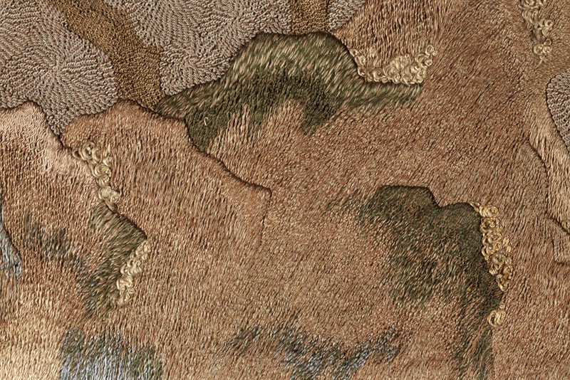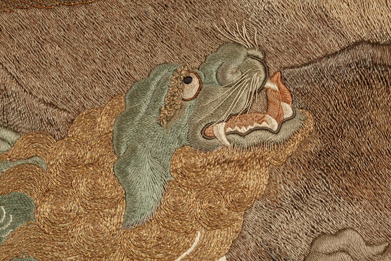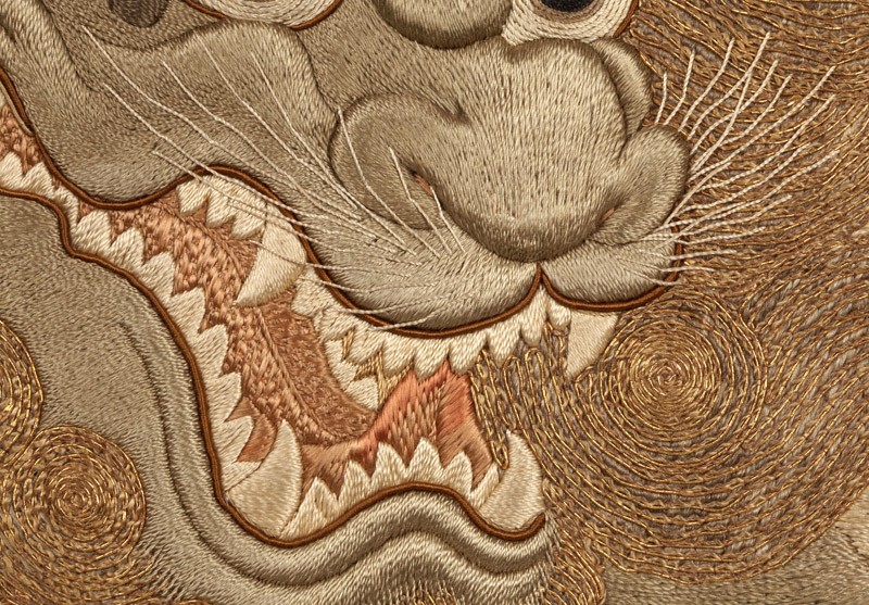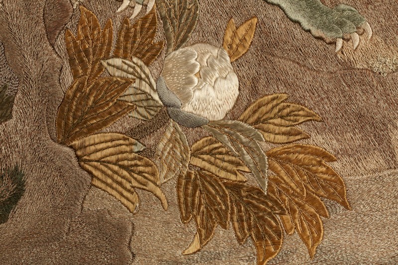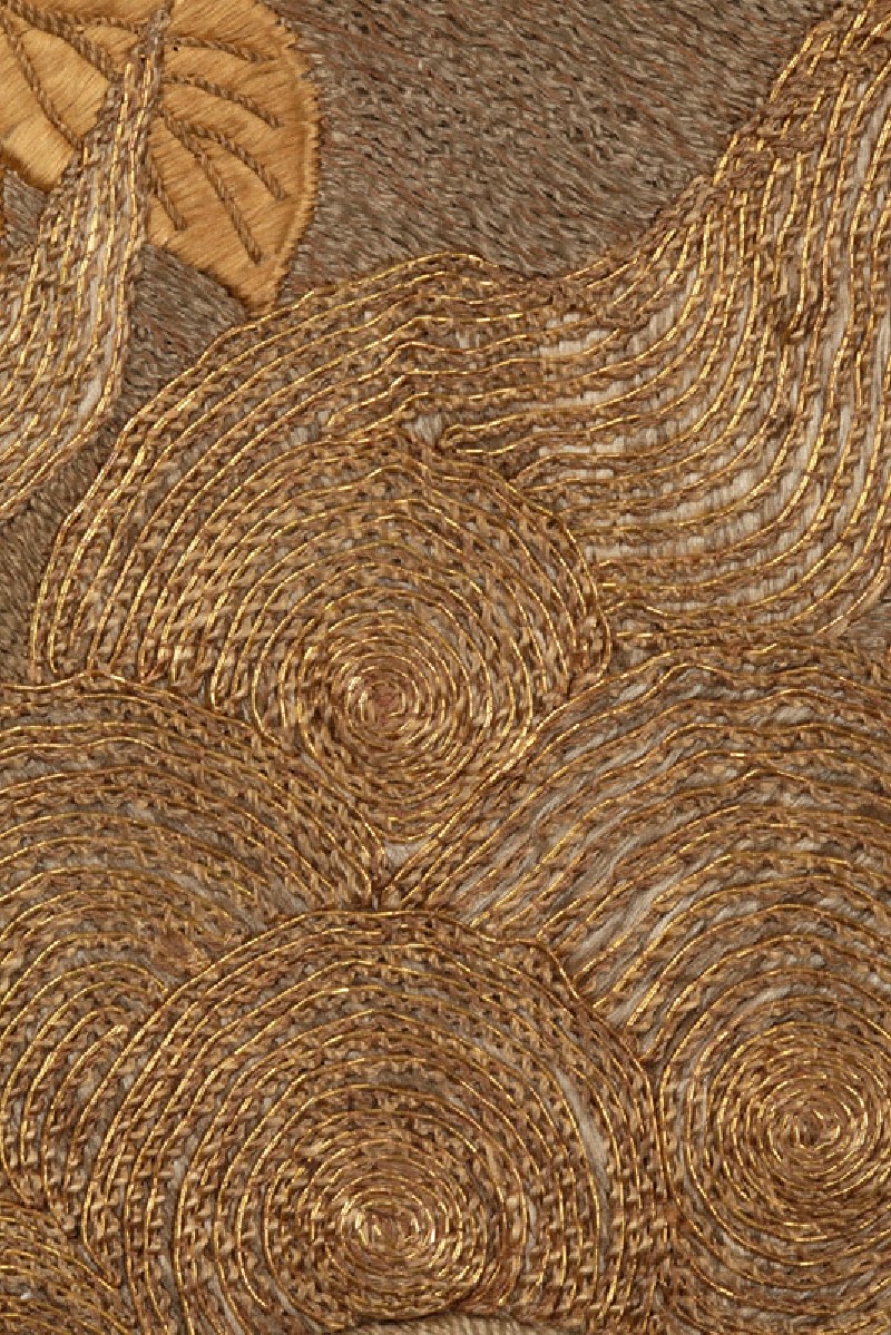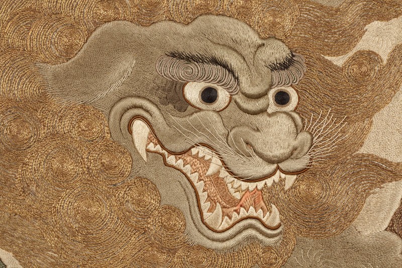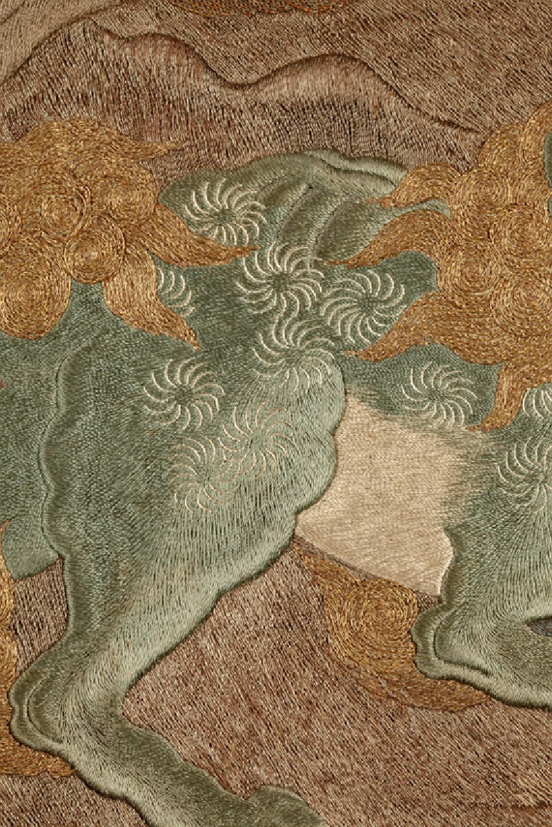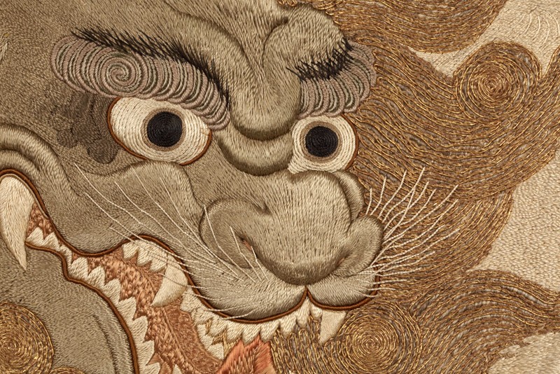 The pairing of shishi and peonies is a traditional one in Japanese art. The shishi was a Buddhist symbol of power and protection, and considered the ‘king of the animals’; the peony, a symbol of wealth and good fortune, was considered the ‘queen of the flowers’, so the two motifs were fitting and auspicious companions. A variety of stitches and threads is used to create different textures for the animals and mountain scenery. (Exhibition number 5)