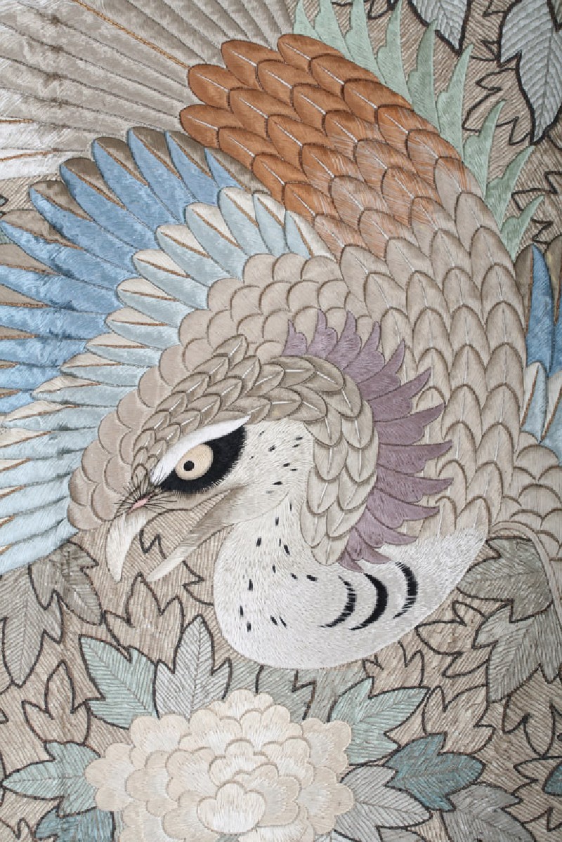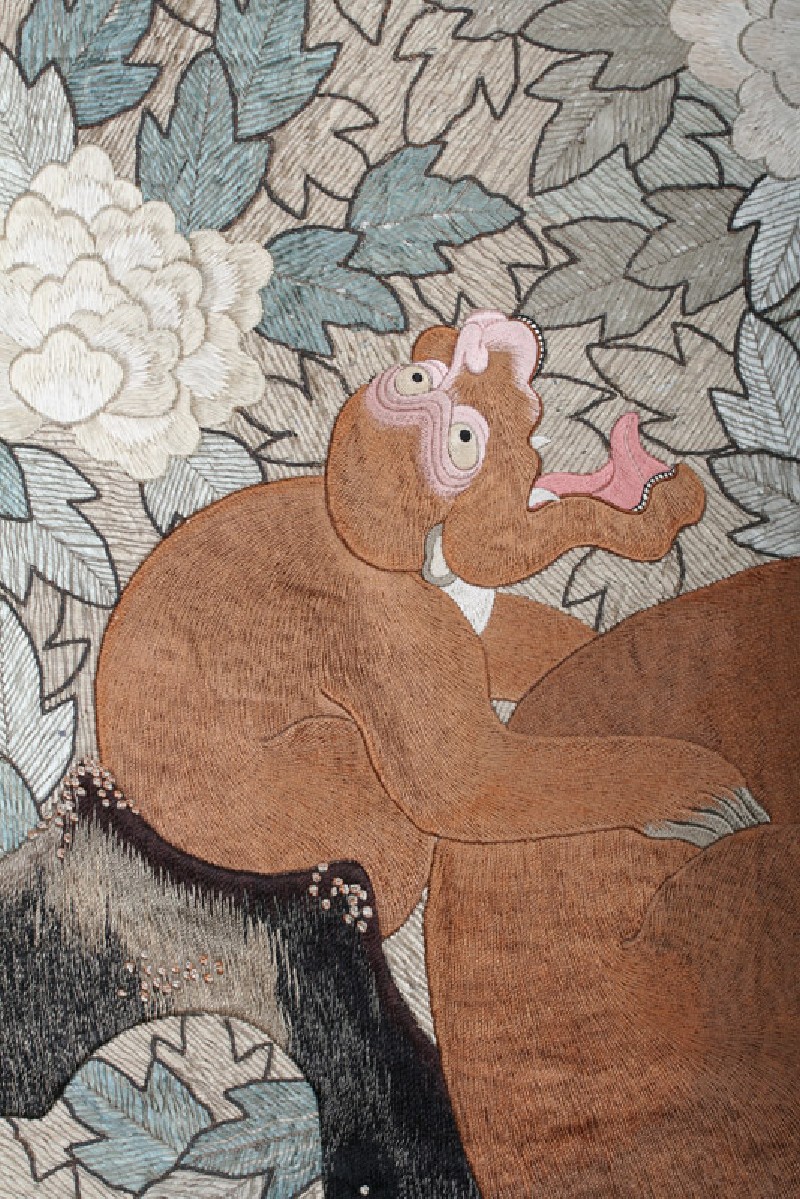 These silk hangings came from Althorp, the Northamptonshire home of the Spencer family, where they were used as bedcovers. The subjects may be drawn from Japanese or Chinese legend. The stylized depiction of water and rocks seen here would have appealed to Victorian customers, who admired the freedom with which Japanese artists used images from nature to create decorative designs. (Exhibition number 26)
