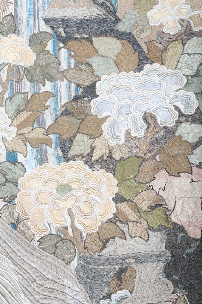 Peacock and peahen on rocks beside a waterfall with peonies