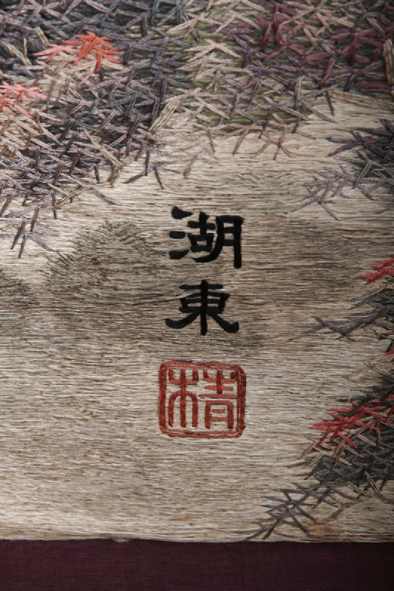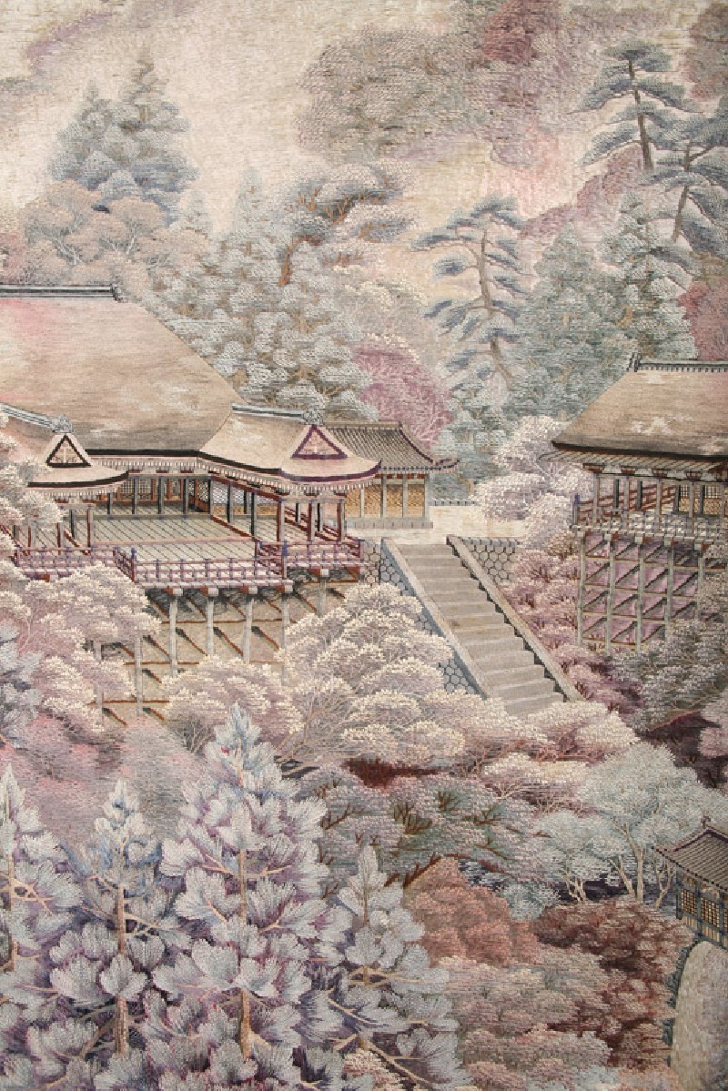 The Buddhist temple of Kiyomizudera, with its famous wooden platform made entirely without nails, was one of the most famous tourist destinations in Kyoto. The textile was made by the Aoki embroidery firm, based in the city of Hikone on the eastern shores of Lake Biwa, an area called Kotō (literally the East of the Lake). (Exhibition number 28)