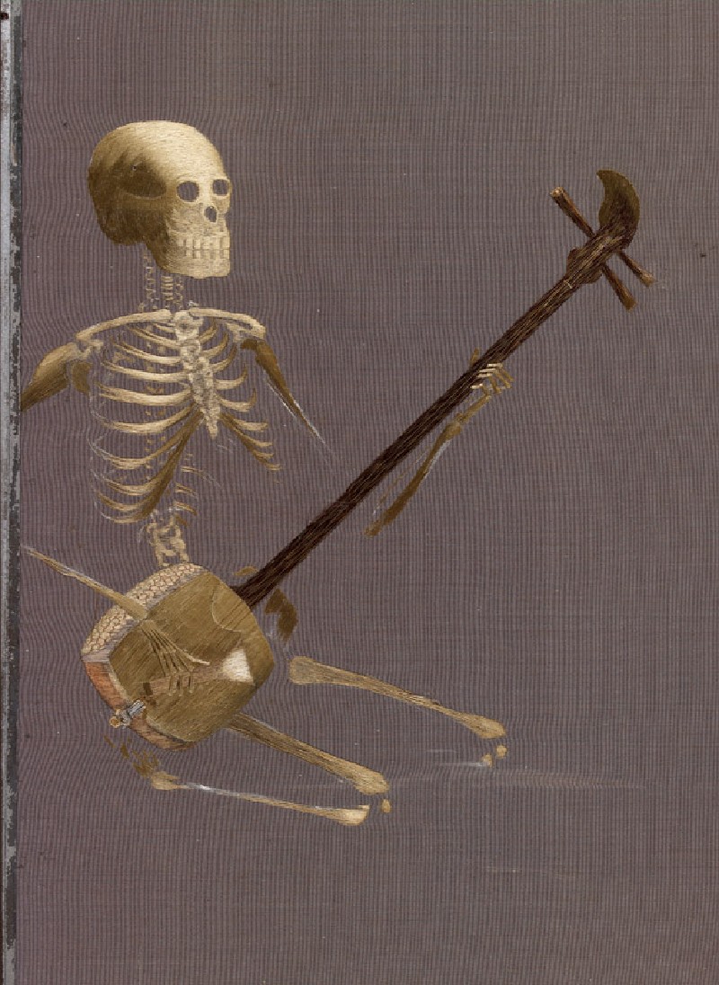 The design for this panel and its pair [LI1956.16.b] was probably provided by the Kyoto painter Takeuchi Seihō, who worked as a designer for the silk manufacturer Iida Shinshichi (Takashimaya). In 1897 Seihō exhibited a hanging scroll of a dancing skeleton that was extremely similar to one of these panels [LI1956.b]. Some thread has been lost here, revealing the gofun shell powder design traced onto the silk ground beneath. (Exhibition number 38)