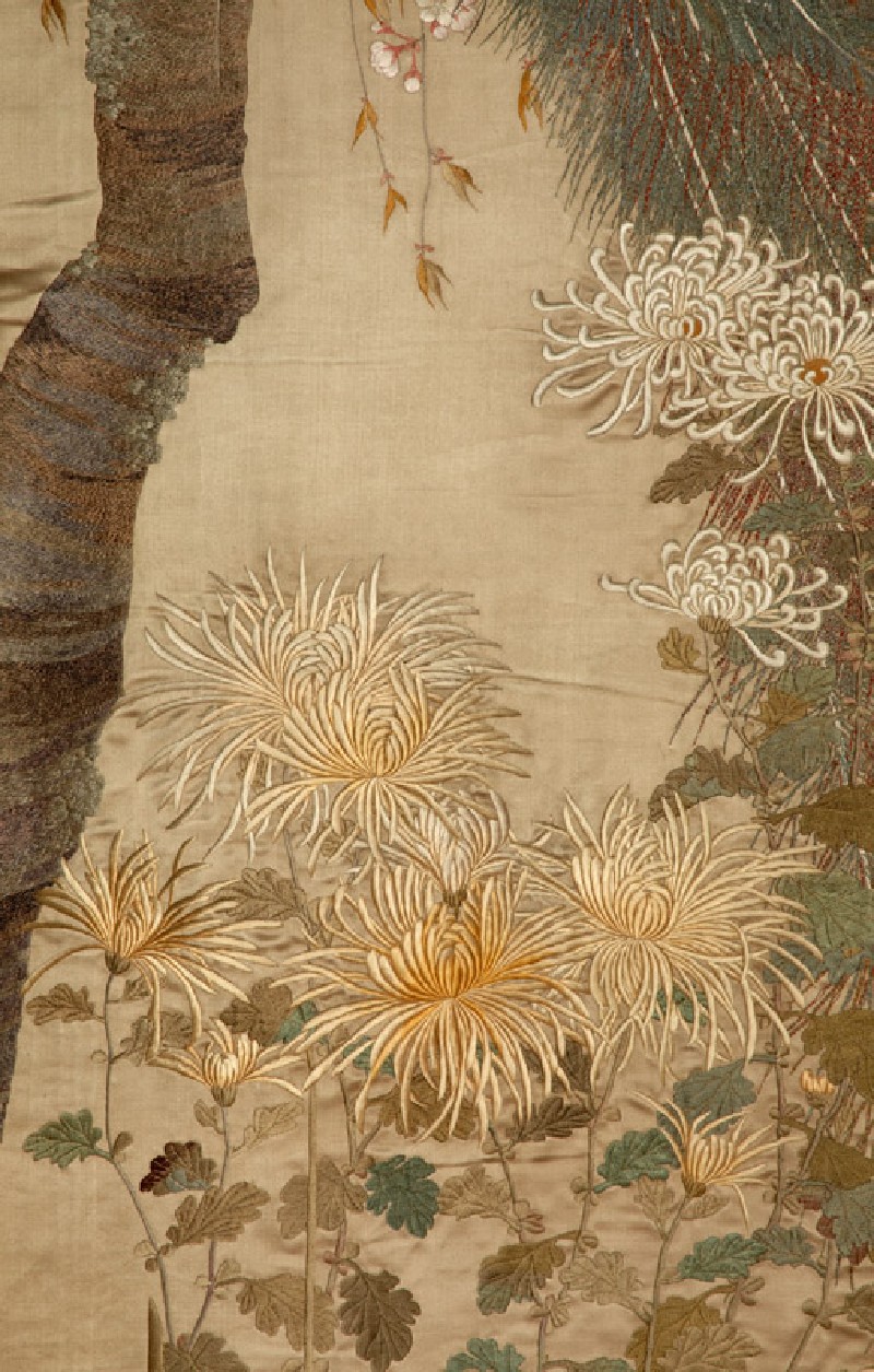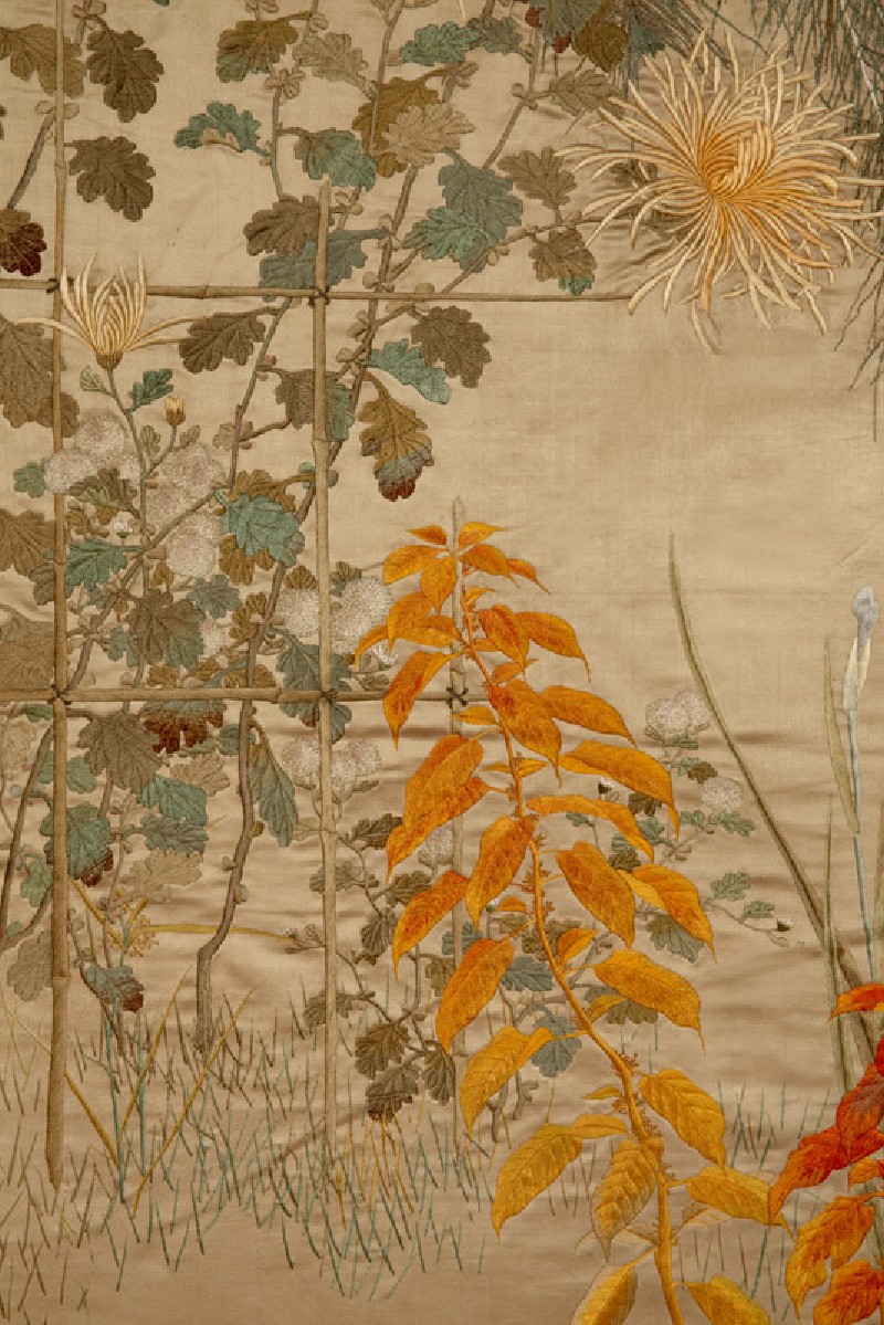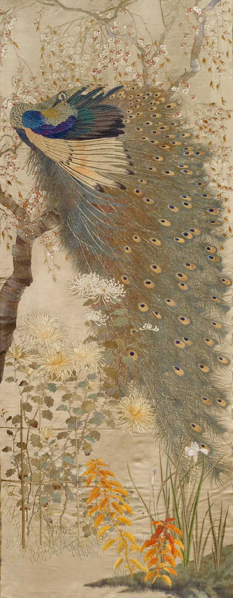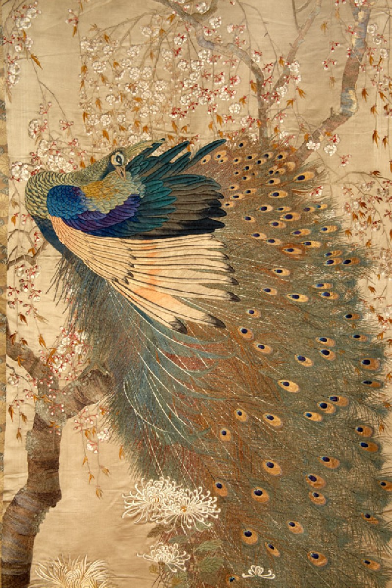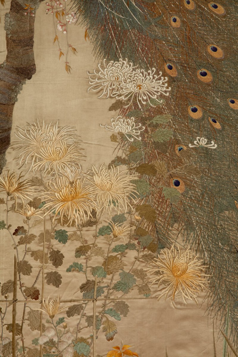 In this pair of very finely embroidered hangings peacocks, sparrows, and various spring and autumn plants are depicted in realistic detail. The fabric for the hangings appears to have been woven specifically for this purpose, with the chrysanthemum-patterned brocade border and the plain central panel made as one piece. (Exhibition number 23)