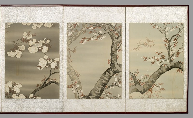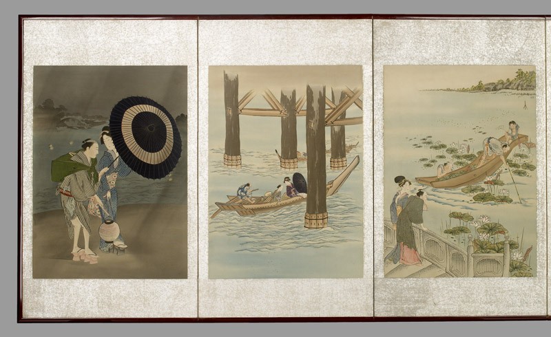 The small size, red-lacquered frame and elegant designs of this screen suggest that they may have been made for a lady’s room. They once belonged to Hirooka Ihei, a well-known Kyoto yūzen silk merchant, who in 1897 pioneered the musen (lineless) yūzen technique. This recreated the soft wash effects of Japanese painting. The designs for these screens were apparently supplied by two celebrated Kyoto painters, Kishi Chikudō (1826-1897) and Mochizuki Gyokusen (1834-1913). (Exhibition number 39)