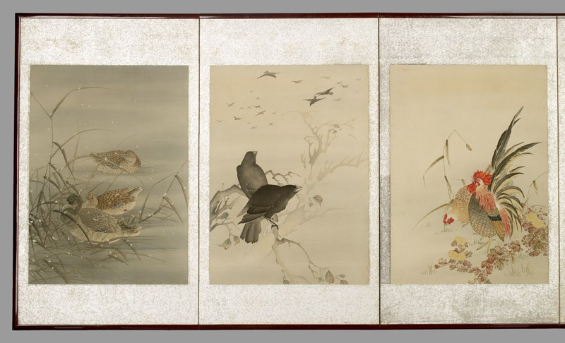 The small size, red-lacquered frame and elegant designs of this screen suggest that they may have been made for a lady’s room. They once belonged to Hirooka Ihei, a well-known Kyoto yūzen silk merchant, who in 1897 pioneered the musen (lineless) yūzen technique. This recreated the soft wash effects of Japanese painting. The designs for these screens were apparently supplied by two celebrated Kyoto painters, Kishi Chikudō (1826-1897) and Mochizuki Gyokusen (1834-1913). (Exhibition number 39)