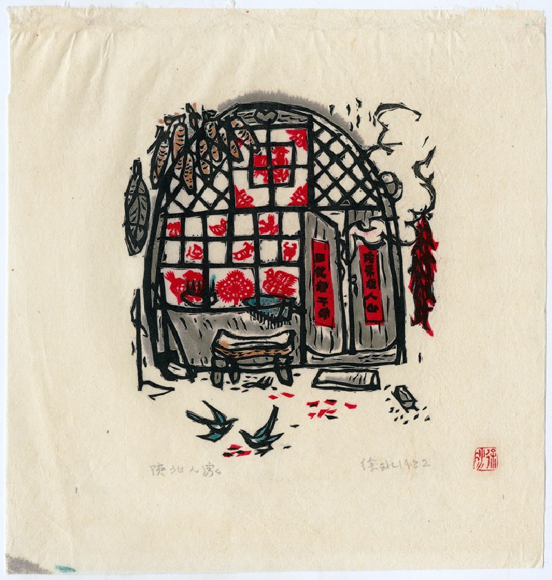 This print shows an ancient form of housing local to one of the many areas in which Xu Bing travelled in the early 1980s, a scene that can also be found sketches elsewhere in this gallery.