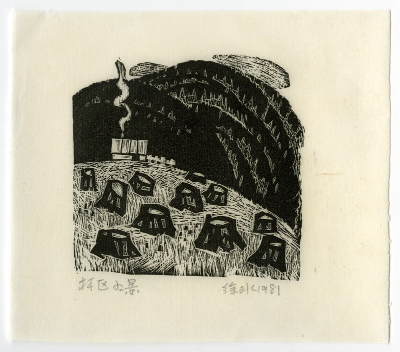 This print is part of the Shattered Jade series which were produced while Xu Bing was a student at the Central Academy of Fine Arts in Beijing. Many depict interactions with nature, and capture the simplicity of rural life. The prints also show some of Xu Bing’s explorations of the print medium and his use of Chinese character forms in the compositions.