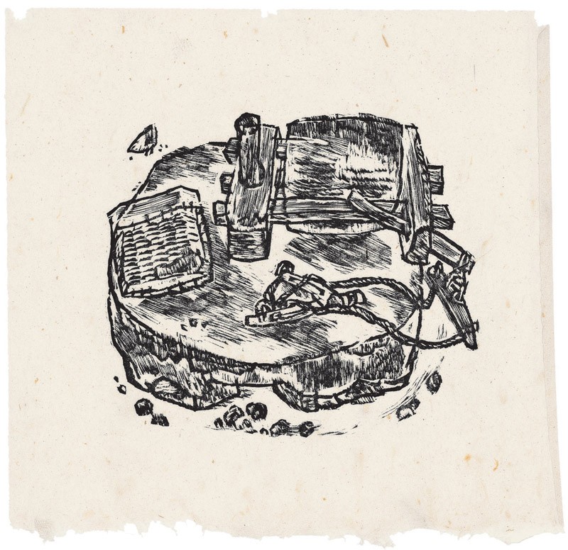 This print is part of the Shattered Jade series which were produced while Xu Bing was a student at the Central Academy of Fine Arts in Beijing. Many depict interactions with nature, and capture the simplicity of rural life. The prints also show some of Xu Bing’s explorations of the print medium and his use of Chinese character forms in the compositions.