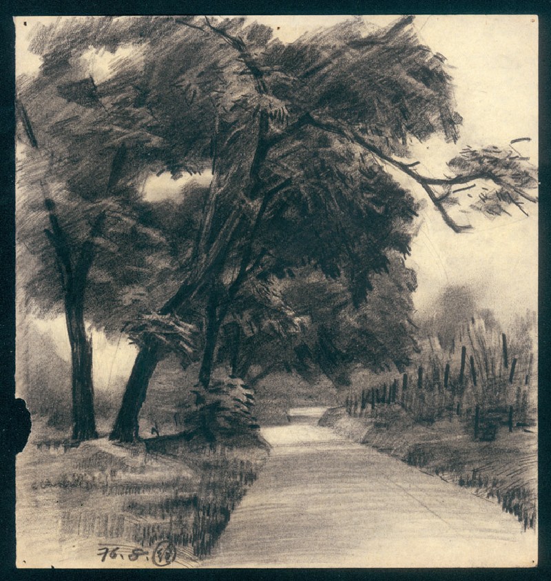 This view of the grounds of Peking University was drawn on one of Xu Bing’s visits home from the countryside village where he spent three years (1974-1977) as an urban youth during the Cultural Revolution (1966-1976). During visits home he saw art exhibitions and on several occasions visited Li Zongjin, an artist and family friend who taught him oil painting.
