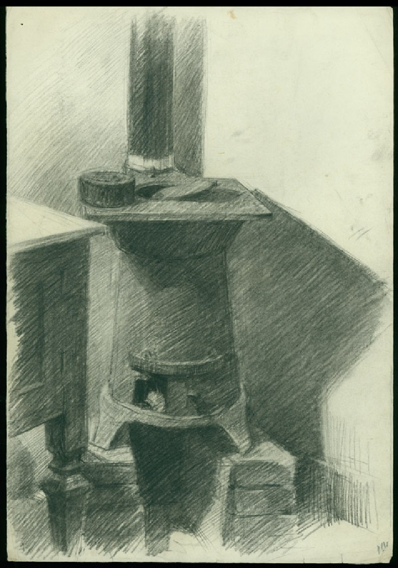 This drawing is the earliest work in the exhibition, produced when Xu Bing was 14 or 15 years old. It depicts a stove in the Xu family home. Adjacent to it is a piece of European, probably French, marble-topped furniture. The drawing is in a Western academic style, reflecting the art teaching Xu Bing had received at school.