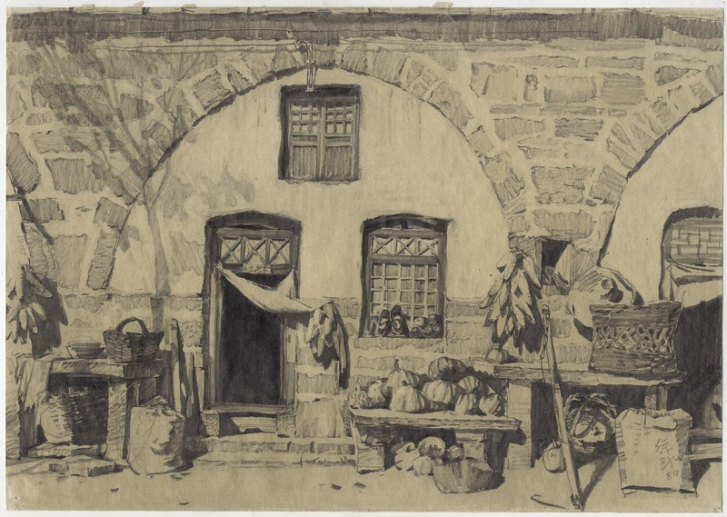 This cave dwelling is cut directly into rock. Most homes of this type are cut into the loess cliffs further north and west of Handan. The drawing exemplifies Xu Bing’s stated preference at the time for depicting simple, everyday things: shoes, tools, baskets, and vegetables are all shown. Xu Bing later made a larger lithograph of this drawing.