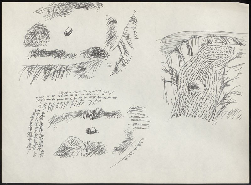 The compositions of these small sketches are similar to some of the small woodcuts and, like those, their subjects are agricultural. The two at the left show stones for separating rice and corn, familiar in European agriculture; the sketch on the right shows an essentially Chinese loess trench planted with rice.