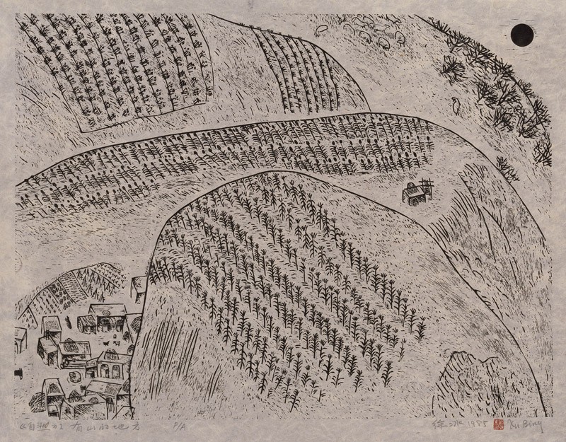 This print brings together many elements seen in Xu Bing’s early woodcuts and landscape sketches, including the sheep seen in one of his sketches (LI2007.45). Their treatment is however quite removed from the drawing of those works from life, and anticipates Xu Bing’s later conceptual prints.