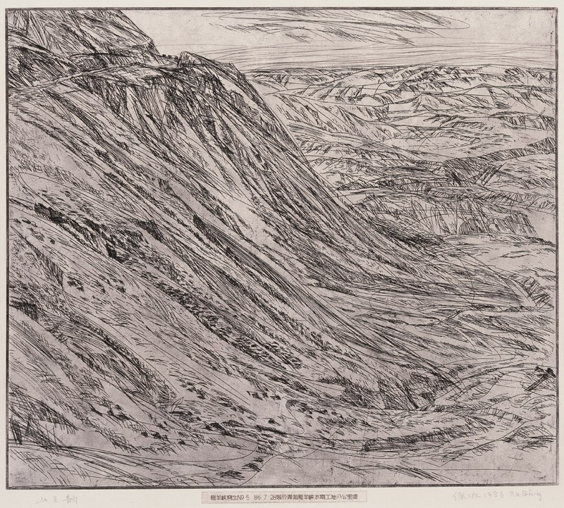 This mountainside shows the site of a hydro-electric power station that was under construction near the Longyang Gorge at the time of Xu Bing’s visit. The etching is a rare example of open-air engraving. Xu Bing took with him to Qinghai province copper plates that had been waxed in Beijing. He scratched through them at the scene to make these two images, which are part of a series, and added the acid when he returned to his local accommodation.