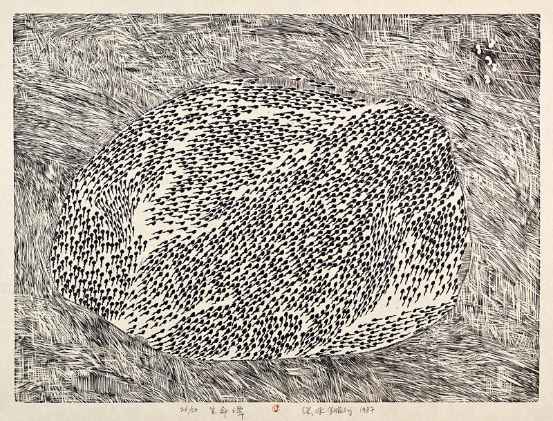 This print belongs to the multi-part work Five Series of Repetitions. A complete scroll from the series (LI2007.63) is displayed in the next gallery. Though many of the motifs in this series of prints, and particularly those relating to landscape, appear in Xu Bing’s early drawings and prints their use here is quite different. Xu Bing has said that the Five Series of Repetitions include much of the groundwork for his Tianshu (Book From the Sky), 1987–1991, which he had begun working on at the time some of these individual prints were produced. They mark his move away from the socialist subjects and concerns of his early career, and his move into the world of contemporary art.