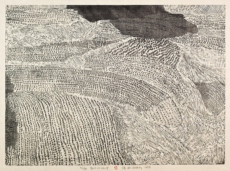 This print belongs to the multi-part work Five Series of Repetitions. A complete scroll from the series (LI2007.63) is displayed in the next gallery. Though many of the motifs in this series of prints, and particularly those relating to landscape, appear in Xu Bing’s early drawings and prints their use here is quite different. Xu Bing has said that the Five Series of Repetitions include much of the groundwork for his Tianshu (Book From the Sky), 1987–1991, which he had begun working on at the time some of these individual prints were produced. They mark his move away from the socialist subjects and concerns of his early career, and his move into the world of contemporary art.