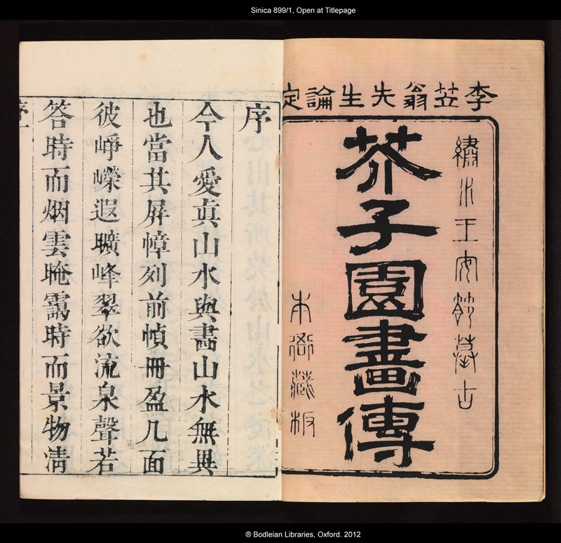 This is the title page of The Mustard Seed Garden Manual of Painting, compiled by Wang Gai in conjunction with Wang Shi, Wang Nie, and Zhu Sheng. It is volume one of three volumes remaining from a five-volume Qing dynasty (1645-1911) edition. Title pages were often placed on top of books outside booksellers’ shops to attract attention to the publication below. The backgrounds were sometimes therefore brightly coloured. Other editions in the Bodleian Library collection have yellow title pages.