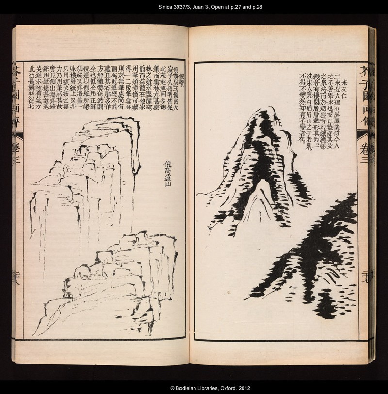 This is the third of five volumes from a Republican era (1911-1949) edition of The Mustard Seed Garden Manual of Painting. This particular page opening illustrates the artists’ Mi Youren (1074-1151) and Ni Zan’s (1301-1374) method for painting mountains. Mi Youren (1074-1151) was the son of one of the most acclaimed scholar painters of the Song dynasty (AD 960-1279), while Ni Zan (1301-1374) is known as one of the Four Yuan (dynasty) masters. The text on the right-hand page comments on the stylistic consistency between Mi father and son, and so emphasises the role of reproducing iconic standards from previous generations.