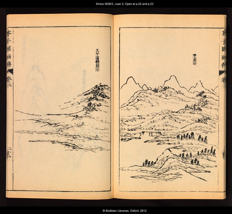 This is the third of 23 volumes, probably from a reprint of the 1812-1817 Japanese edition of The Mustard Seed Garden Manual of Painting. This particular page opening illustrates the method for painting rounded peaks in the level distance. The image on the right here is the one that concludes Xu Bing’s The Mustard Seed Garden Landscape Scroll [LI2007.77]. It is an example of how to paint distant mountains, and is used by Xu Bing to depict countryside. This gives a feeling of the scroll composition moving back to countryside after passing through a more urban environment.