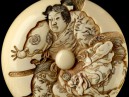 Beneath a full moon, the agile young Minamoto no Yoshitsune, trained in martial arts by the tengu demons, leaps over the warrior-monk Benkei’s halberd on the Gojō Bridge in Kyoto. Benkei, who is collecting by force 1000 swords from innocent passers-by, has met his match. He has managed to remove Yoshitsune’s white silk overgarment used as a disguise, but cannot defeat the youth. Benkei was so impressed with the young warrior, that he swore allegiance to Yoshitsune and they remained inseparable until death.