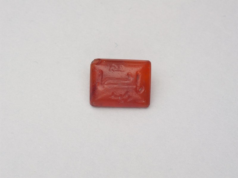 Cornelian; cabochon, plain-convex (but the back face has two triangular facets); very slightly bevelled towards the back (this edge is very narrow); rectangular; back angle cut. One central line (2) and two secondary lines (1 and 3) of kufic script, without points. In the third line faraja or fariḥa or a word derived from these roots can be distinguisged. The small group of letters in the first line is not very clear, perhaps it would be possible to read fī. The key word for the reading of the whole seems to be the word in the second line, but the only reading I can propose is li-kulli which is difficult to read in this way with the word proposed in the first line. I do not think the inscription contains a personal name, but rather a proverb or a maxim.