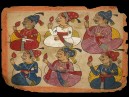Seated on a striped durree rug beneath a canopy, a nobleman and lady play a game of chaupar while resting from their journey. The riding-camel nearby suggests that this couple may be the legendary Rajasthani lovers Dhola and Maru, who eloped on a camel. Chaupar or pachisi (the ancestor of modern Ludo) is a race game played with dice on a cruciform board, usually made of cloth. Here the lady moves one of her pieces, while the nobleman holds the three stick dice whose roll will determine the next move.
