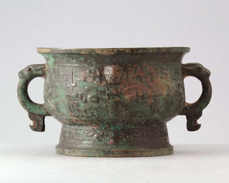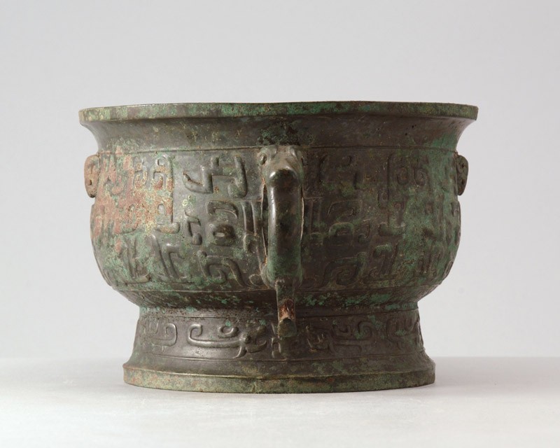 A Chinese ritual food vessel with a deep bowl on a foot ring and handles.
