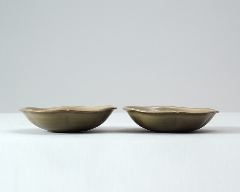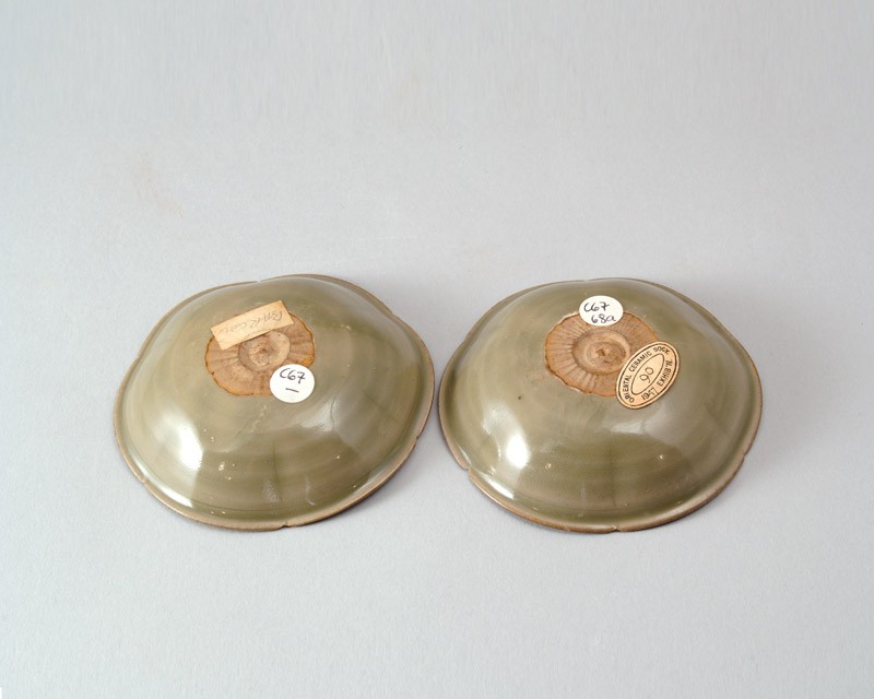The small dishes are of rounded form, the sides six times indented on the outside, the lip turned over and with six associated cut-outs, the centre clearly marked. The pieces are covered with an even olive-green glaze. They are made without a separate base or foot, but have an unglazed patch on the underside, with a carved circular groove.