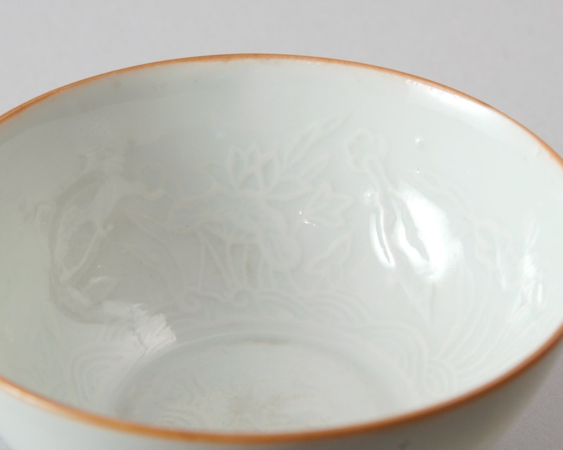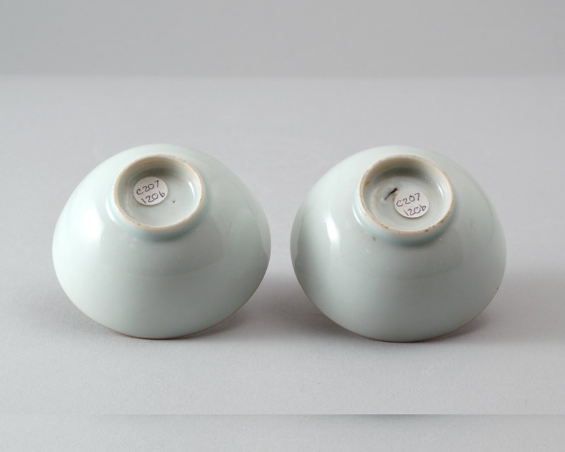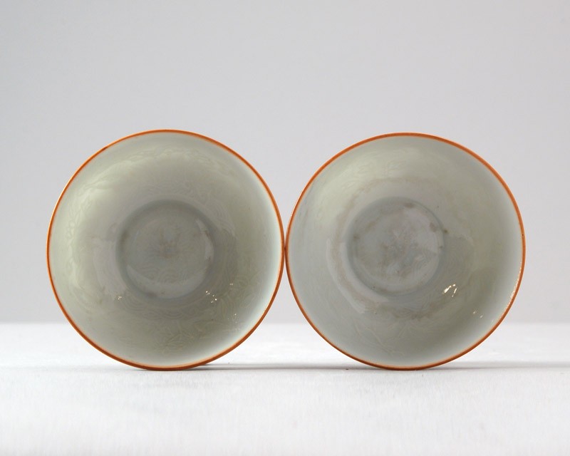 The rounded cups have a small tapering foot with recessed base which is domed on the inside. The inside is moulded in slip relief with a central design of a crab above waves below clouds and the sides with four different fish between clusters of lotus and arrow-head emerging from a band of undulating waves. The glaze has a bluish tinge, the rim is dressed in a bright orange-brown, the outsides are plain and only the underside of the footring unglazed. The walls are highly translucent.