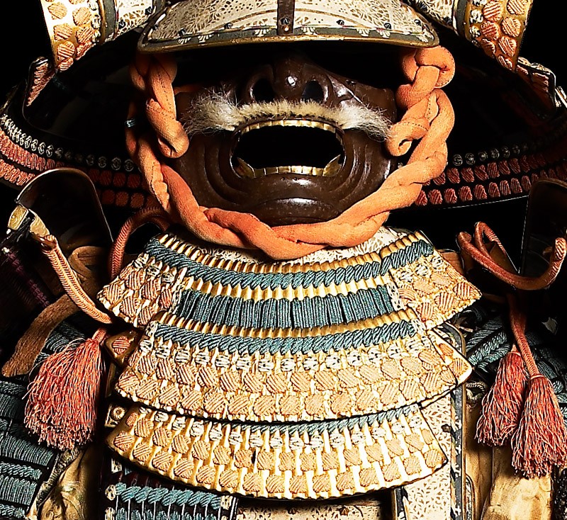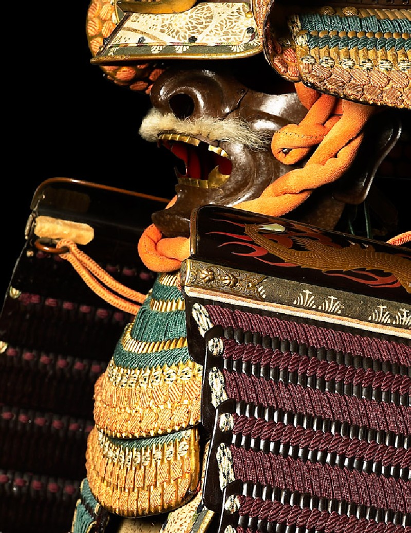 This suit of armour was made during the peaceful Edo period, when samurai wore armour only on ceremonial occasions, to show off their rank and wealth. It is made of small plates of lacquered metal laced together with silk cords. The armour is tough, flexible and much lighter than a European steel suit. The helmet is older than the rest of the armour: an inscription inside dates it to 1560.