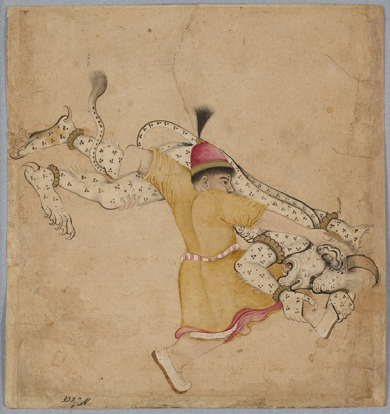 A stocky hero wrestles a fierce div (demon), lifting and overturning him. Overcoming demons was a speciality of Rustam, a hero of the Persian Shahnama epic, but this unassuming figure lacks his usual war-like accoutrements. This coloured drawing closely follows in reverse a 15th century Turcoman composition found in one of the famous Siyah Qalam album paintings in the Topkapi Library, Istanbul.