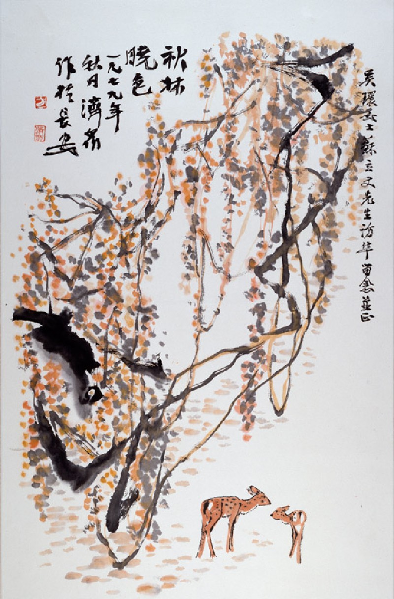 This painting was produced by Fang Jizhong (1923-1987). Fang is celebrated for his portrayal of goats. Chinese critics have spoken of a distinct Shaanxi School of landscape painting based at the Xi’an Academy in northwest China, with Fang and his teacher Zhao Wangyun (1906-1977) being the leading representatives. This painting, however, doesn’t show such a strong regional character, perhaps because of the subject matter the artist chose, of a deer in an autumn forest. It was painted in autumn of 1979 and inscribed by the artist to Khoan (1919-2003) and Michael Sullivan (1916-2013) in Xi’an. The inscription reads ‘Autumn Forest at Dawn. Painted by Jizhong in autumn of 1979 in Chang’an. For Madam Wu Huan and Mr. Michael Sullivan to correct and as a memento of their visit to China.’