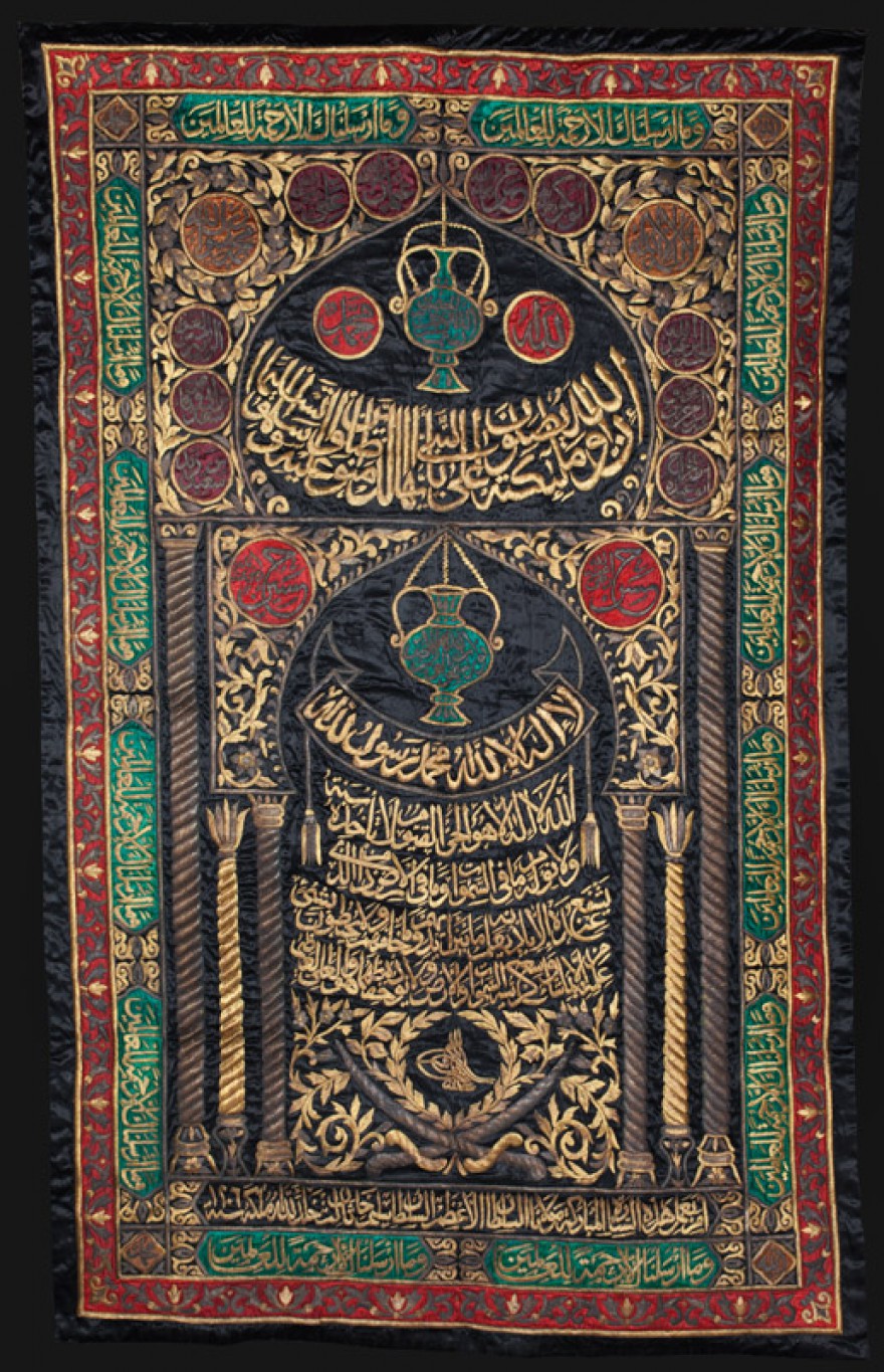 The sitarah was commissioned by the Ottoman sultan Selim III in AH 1206/AD 1791-1792, following a centuries-old tradition maintained by the Ottomans after they gained control of the Hijaz and the Haramayn (holy sanctuaries of Mecca and Medina) from the Mamluks in 1517. Similar textiles were made and presented yearly during the processions associated with the hajj, the Islamic pilgrimage to Mecca. The curtain was generously donated by Dr. Nasser D. Khalili, a dedicated collector and passionate scholar of Islamic art whose collection is among the largest and most comprehensive in the world.